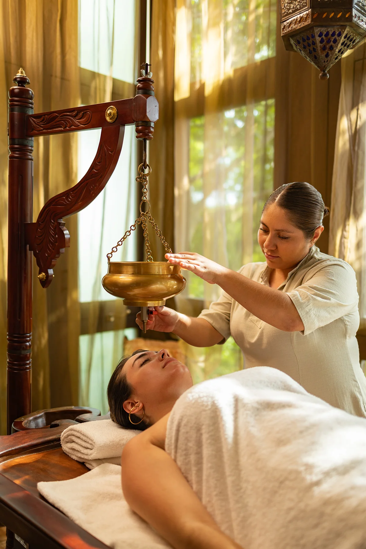 El masaje Shirodhara es un tratamiento que, a través del flujo constante de aceites de hierbas sobre el tercer ojo y un masaje suave sobre el cuero cabelludo, ayuda a la relajación del sistema nervioso, la disminución del estrés, la ansiedad y el insomnio, así como la estimulación del organismo. Para finalizar, un baño de inmersión en una tina de cobre es la cereza del pastel.
